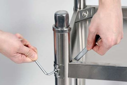 Blat może osiągnąć nośność do 150 kg, ponieważ jest wykonany z masywnej blachy o grubości 0,8mm z dodatkowymi profilami wzmacniającymi. Od spodu blat jest wzmocniony laminowaną płytą wykonaną z drewna o grubości 20mm, jest ona odpowiedzialna za usztywnianie go i wygłuszanie, a przy tym jest także odporna na wilgoć. Niżej postawiona pólka dolna o nośności 35 kg pozwala na przechowywanie podręcznych naczyń i urządzeń. Nogi stołu możemy regulować w zakresie +/-15mm, są one wykonane z okrągłych profili. Regulacja pozwala na dopasowanie się stołu nawet w nieidealnych warunkach. Dzięki plastikowym nakładkom na nogach nie będzie ryzyka porysowania podłogi i uzyskamy stabilne położenie stołu.
